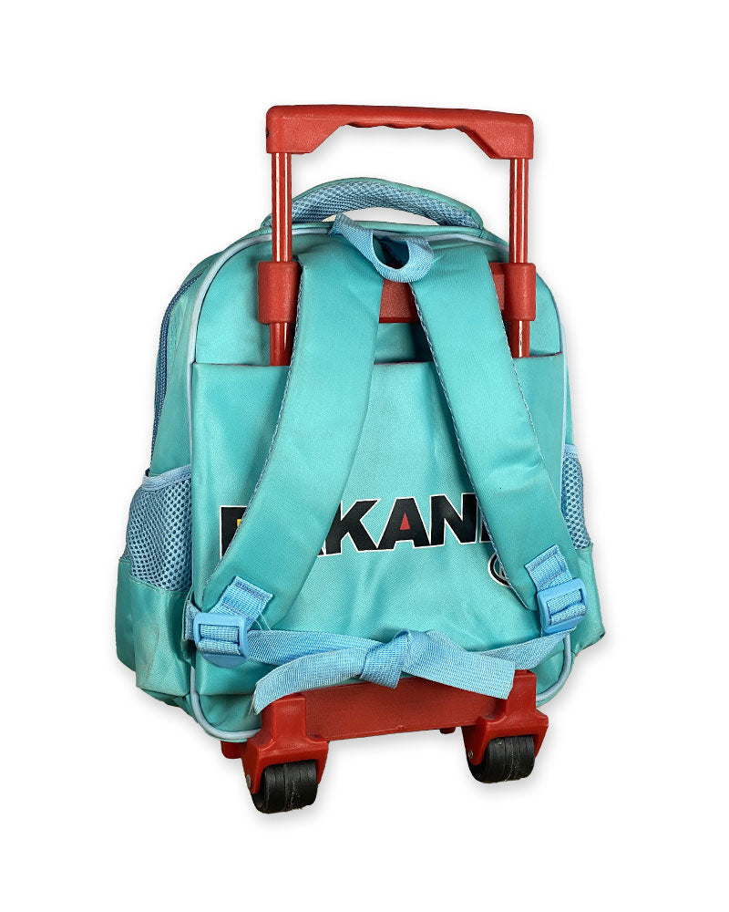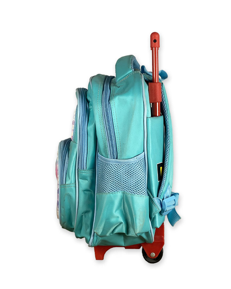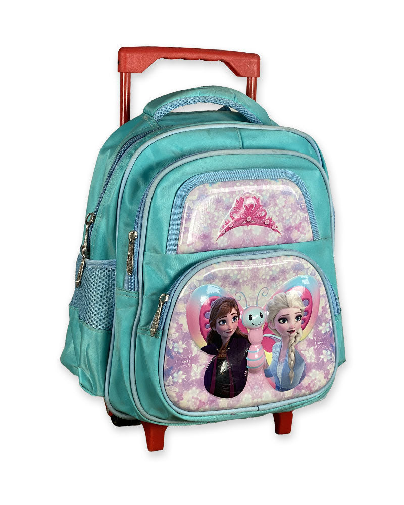 Durable turquoise trolley backpack featuring beloved Frozen characters, perfect for school and travel. Lightweight with multiple compartments and smooth rolling wheels for easy mobility.