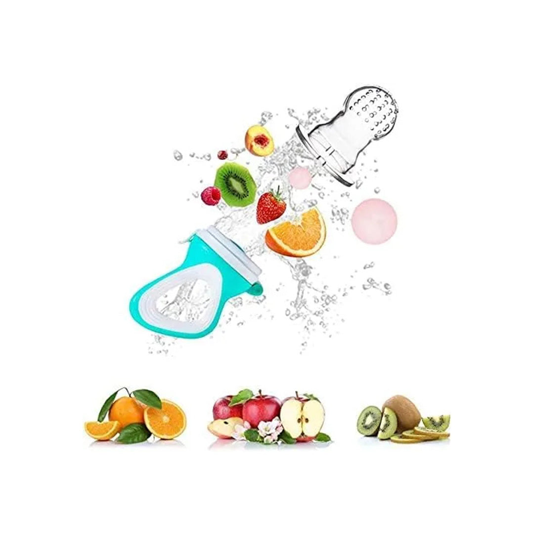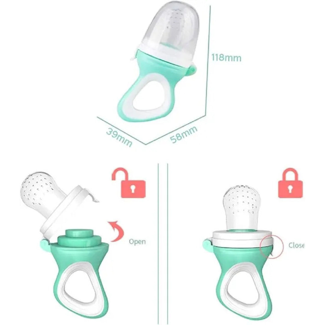 Multi-use feeder teether for safe fruit feeding and teething relief.