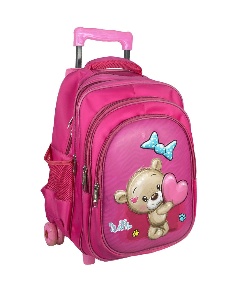 3D Print Teddy Bear Girls Trolley Backpack – Pink Rolling School Bag with Cartoon Design